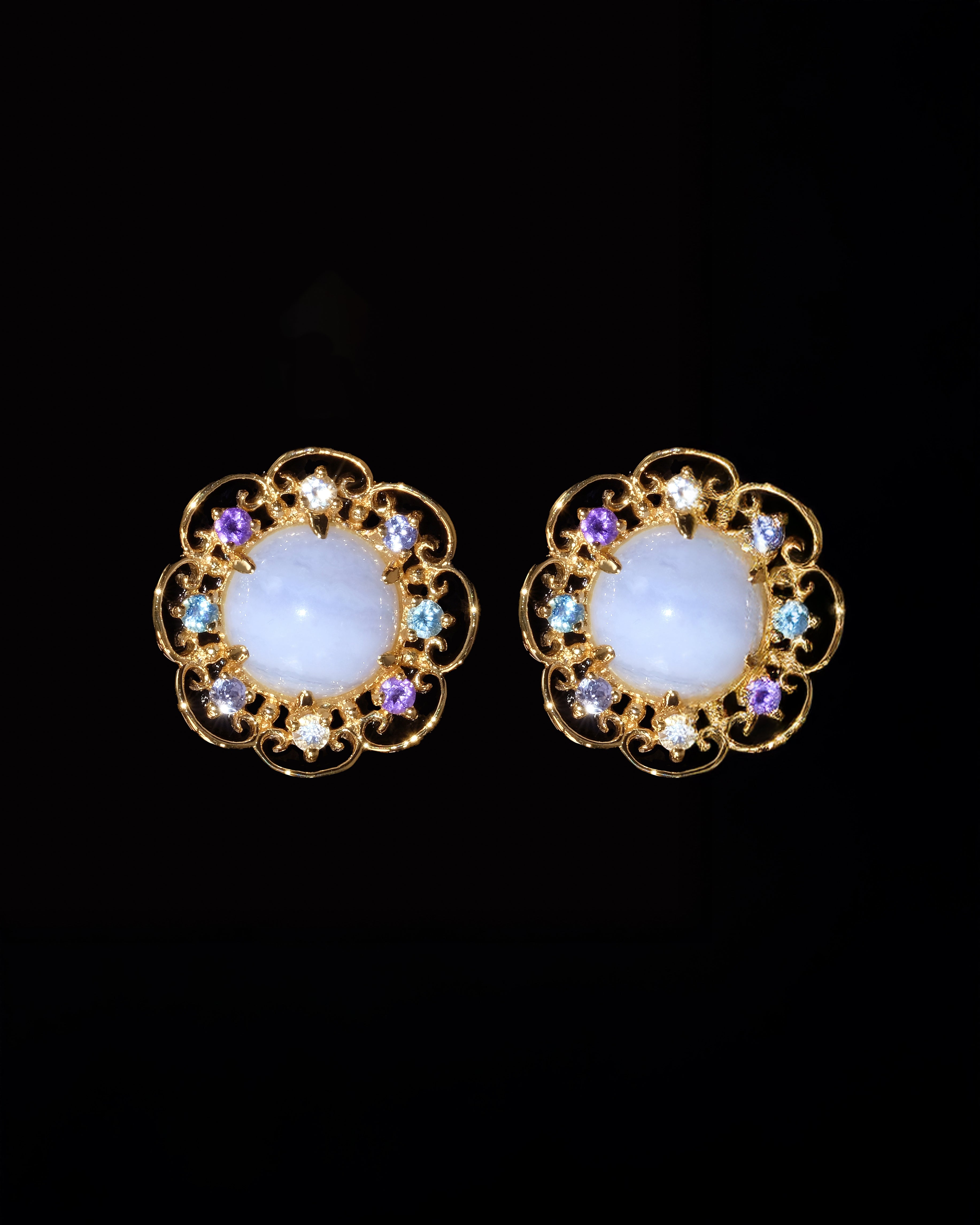 中心に据えたカボションは“光の起点”と見立て、 そこから放射するように透かし模様と天然石を配置しています。