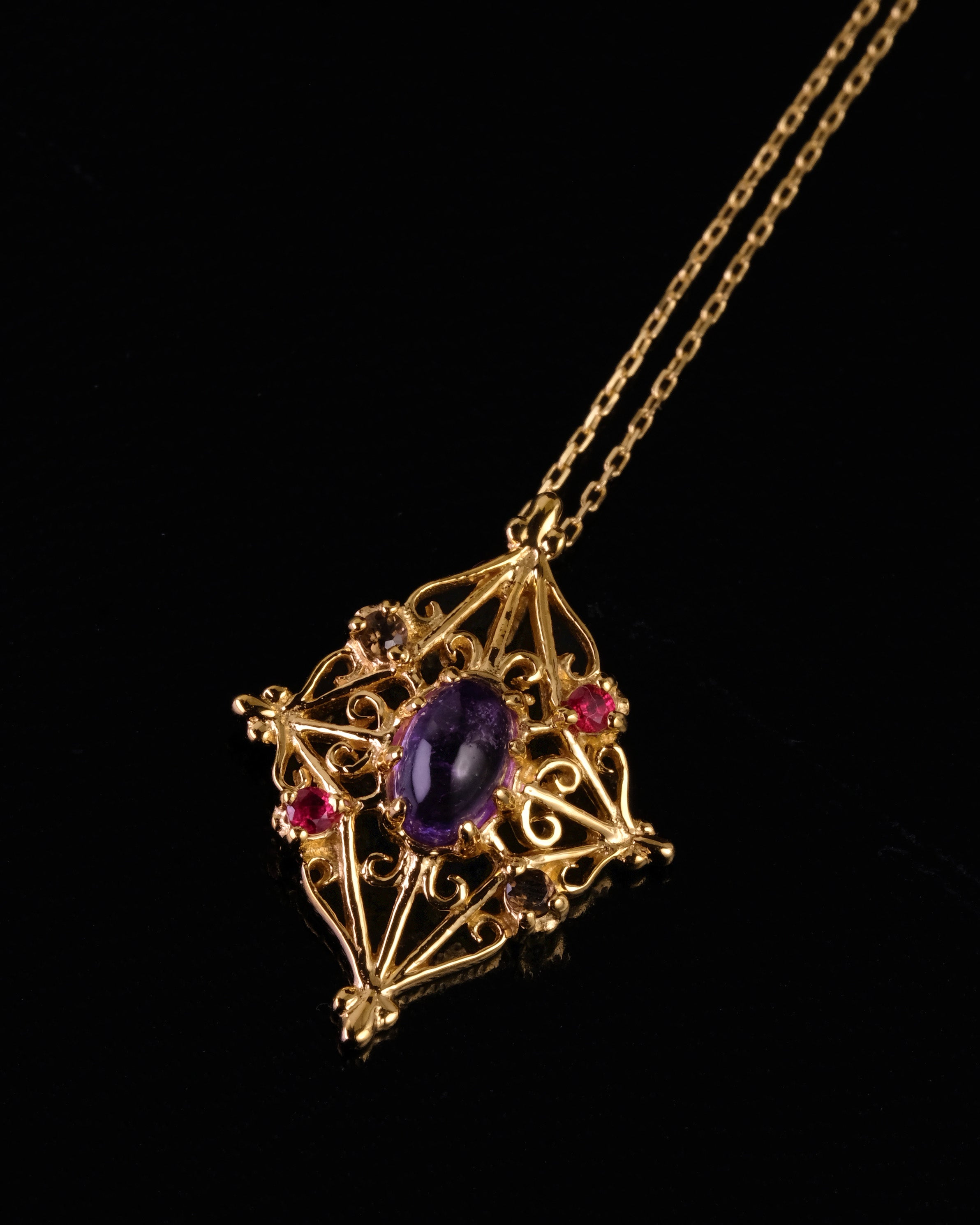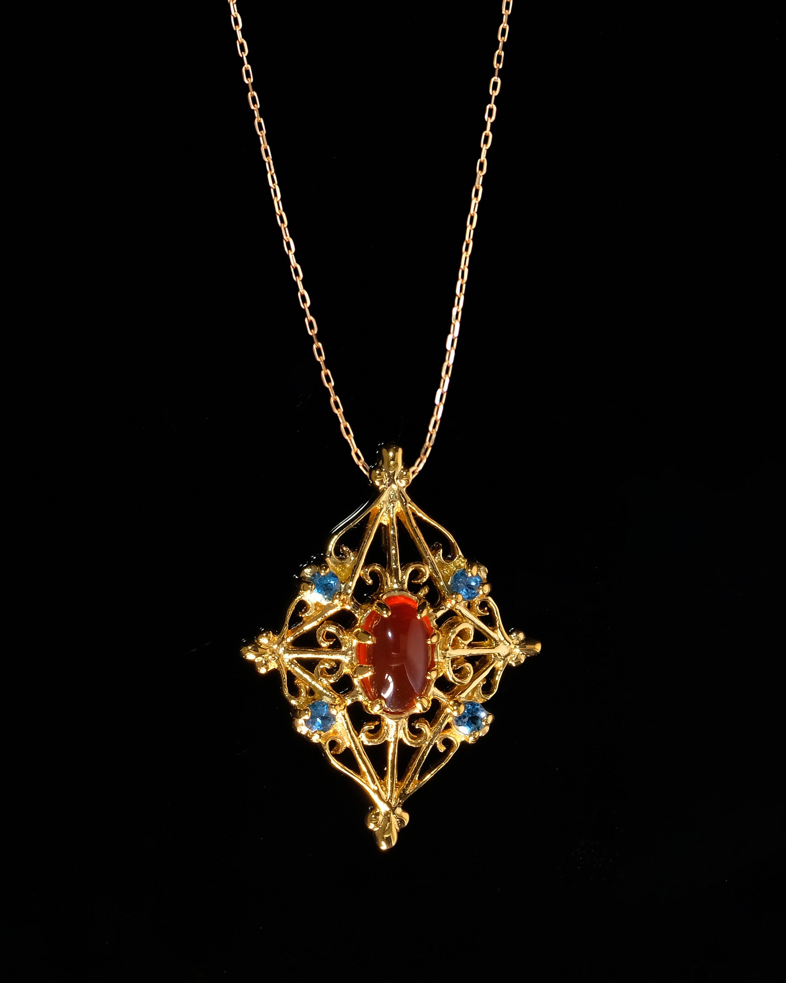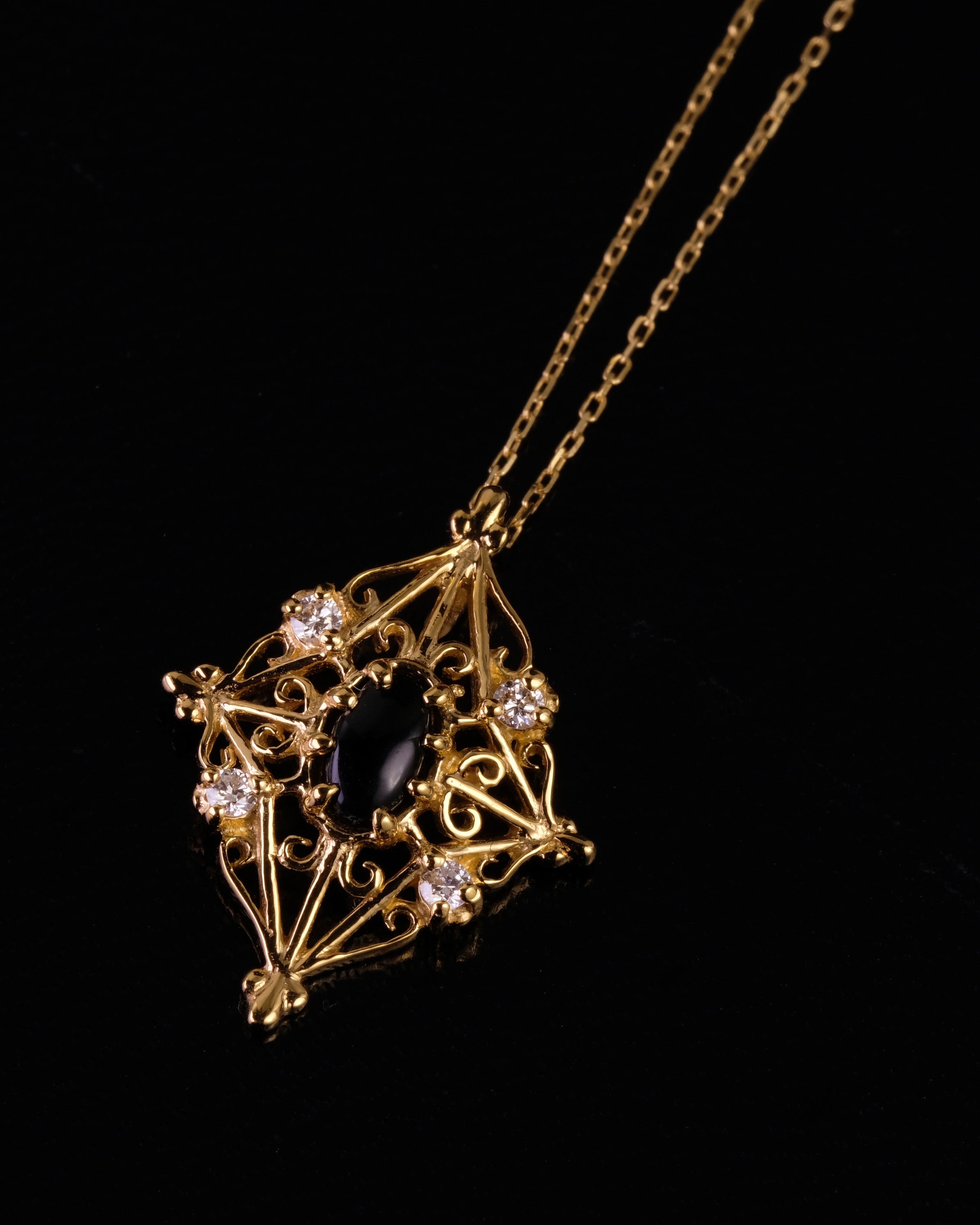 中心に配したカボションストーンから四方へと広がる繊細な装飾は、 聖堂を彩る窓枠や格子の記憶を受け継ぐもの。