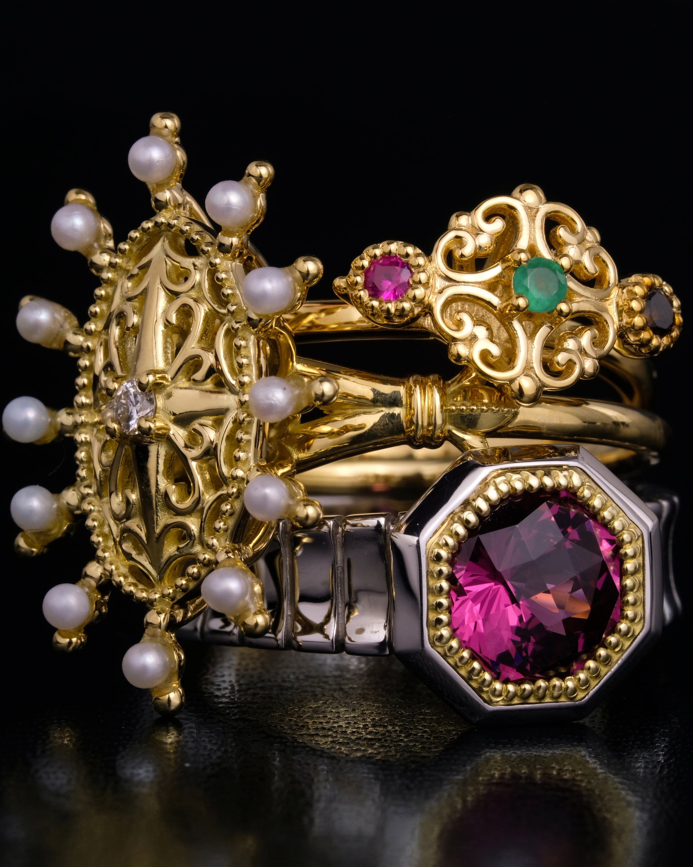 A one-of-a-kind collection made with unique colored stones set as the main setting.
