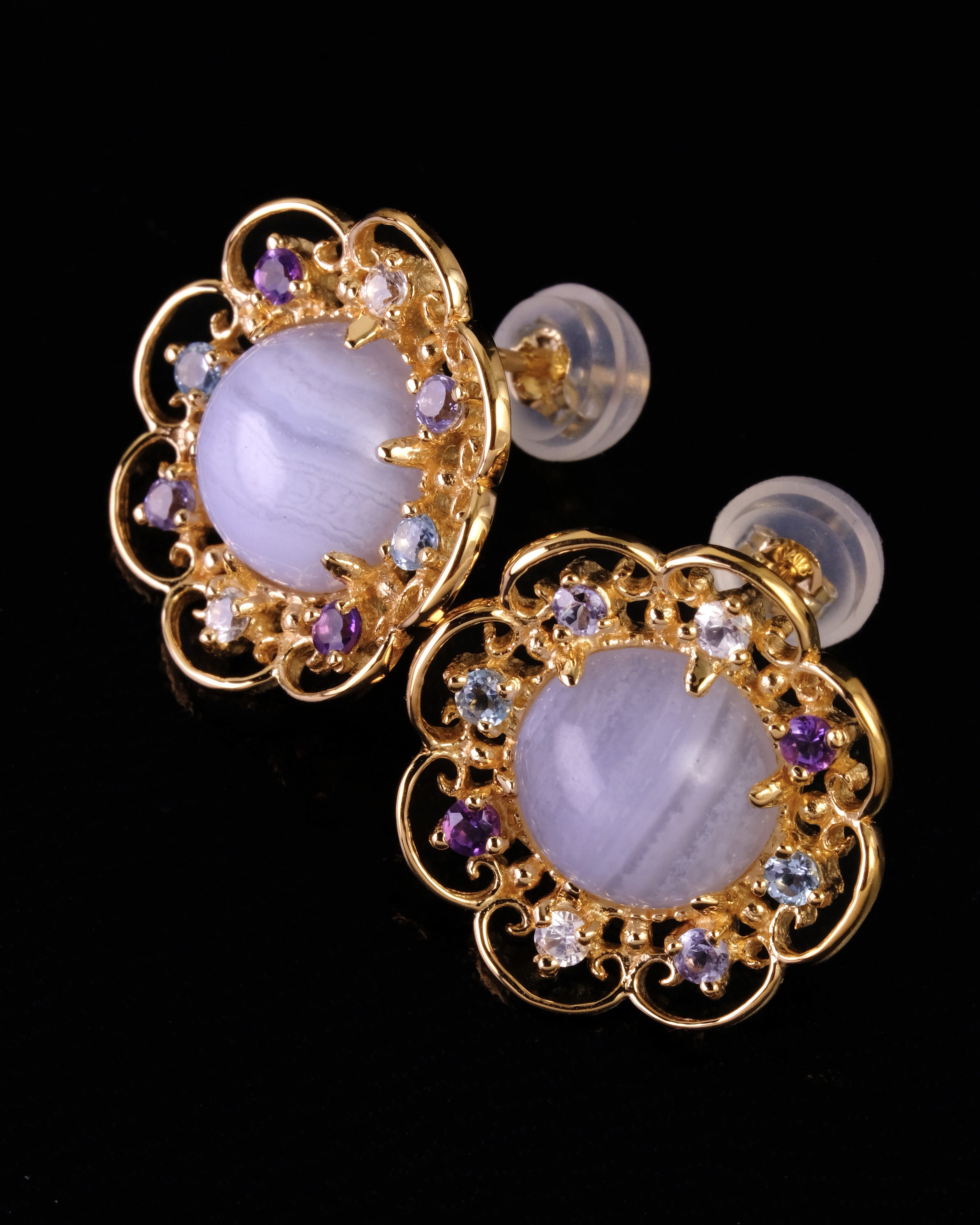 中心に据えたカボションは“光の起点”と見立て、 そこから放射するように透かし模様と天然石を配置しています。