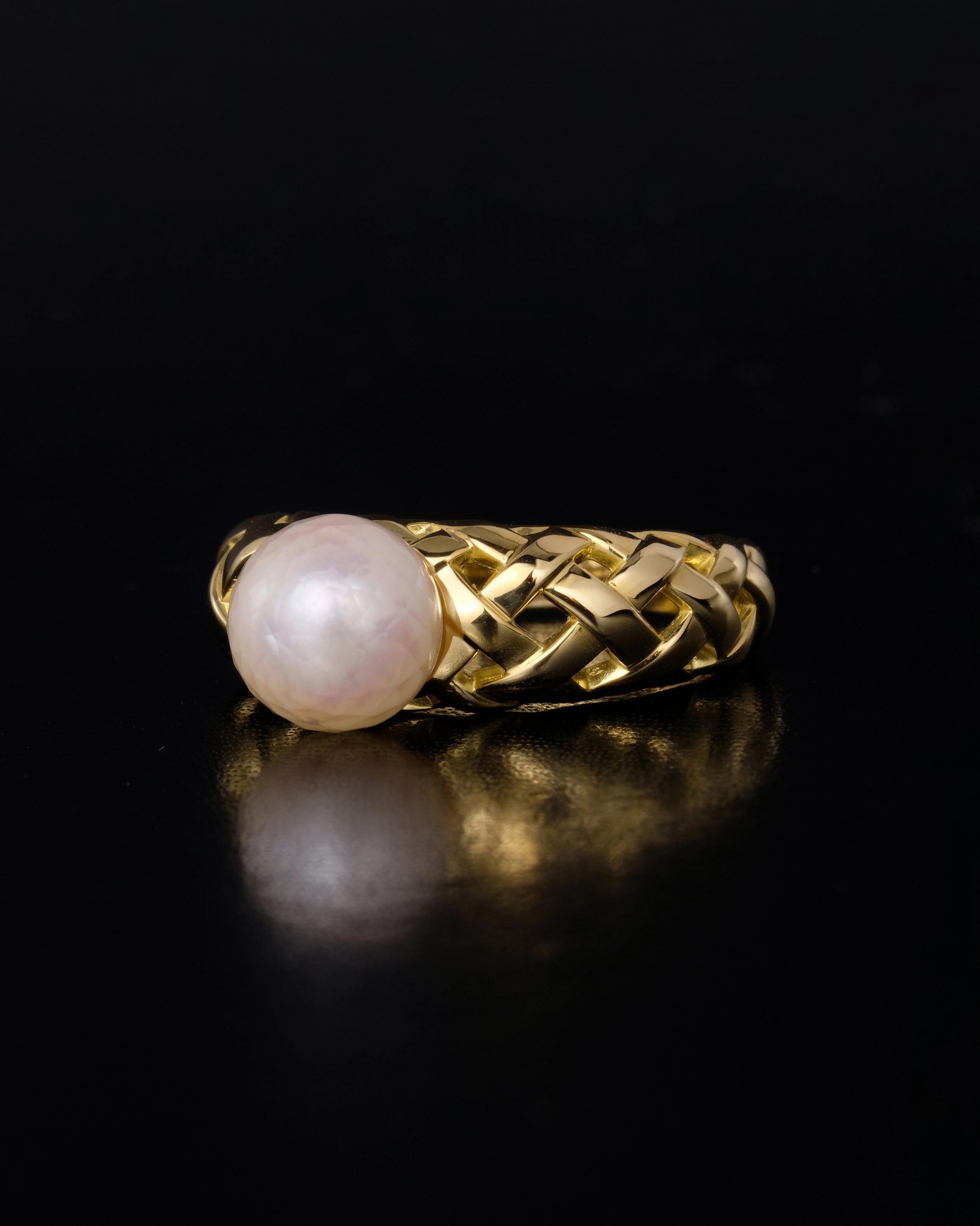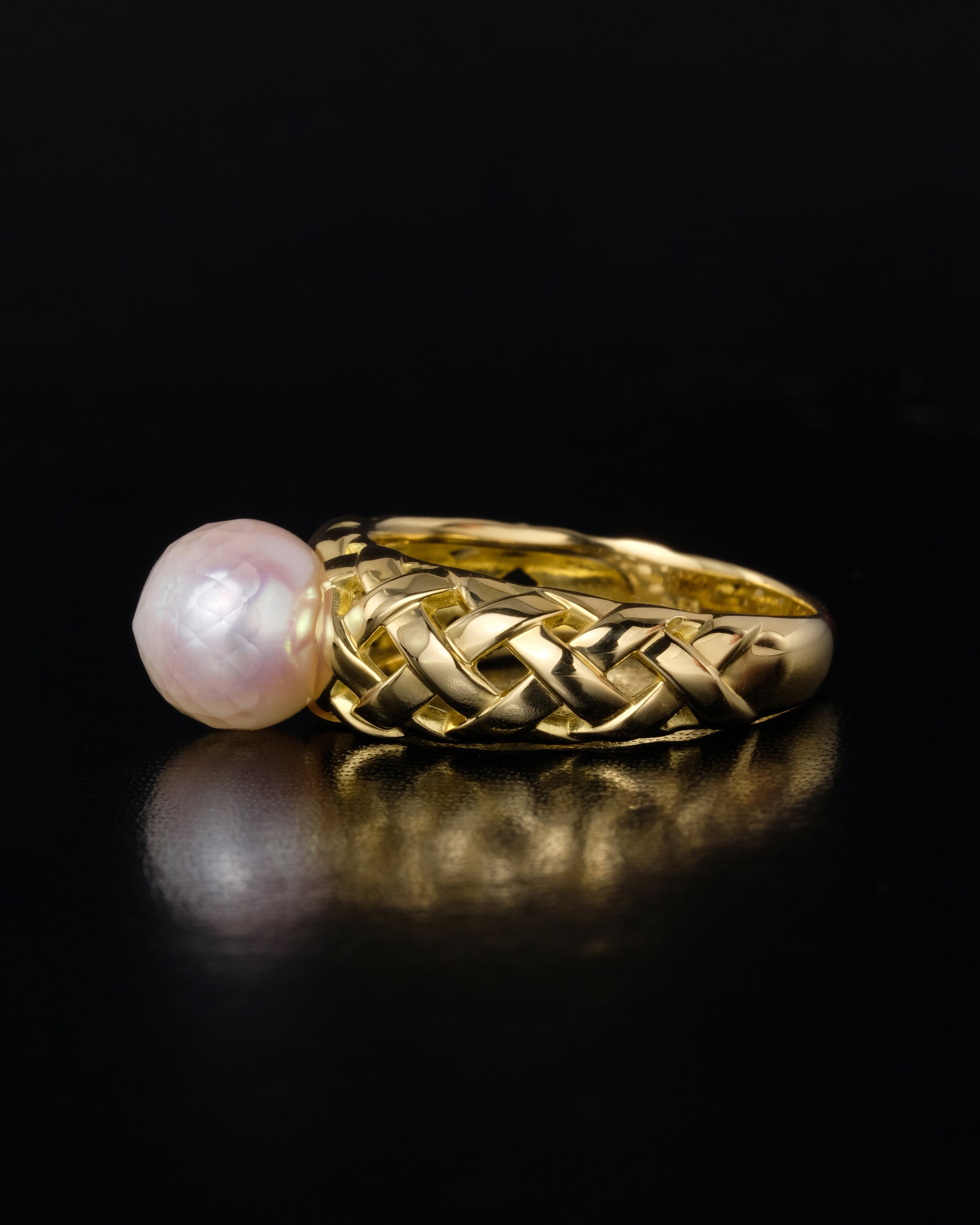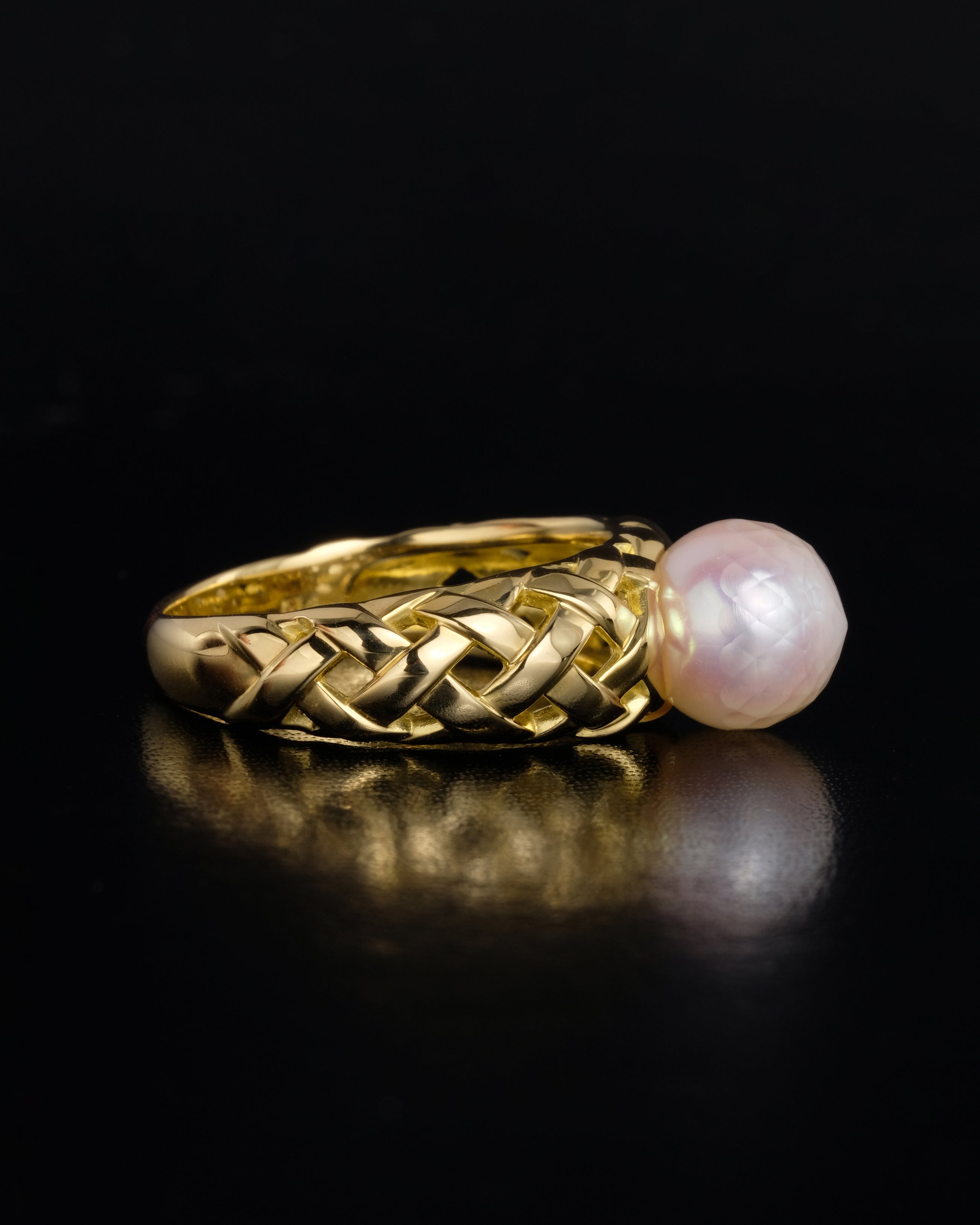 半面にファセットカットを施したあこや真珠の重厚なリング。