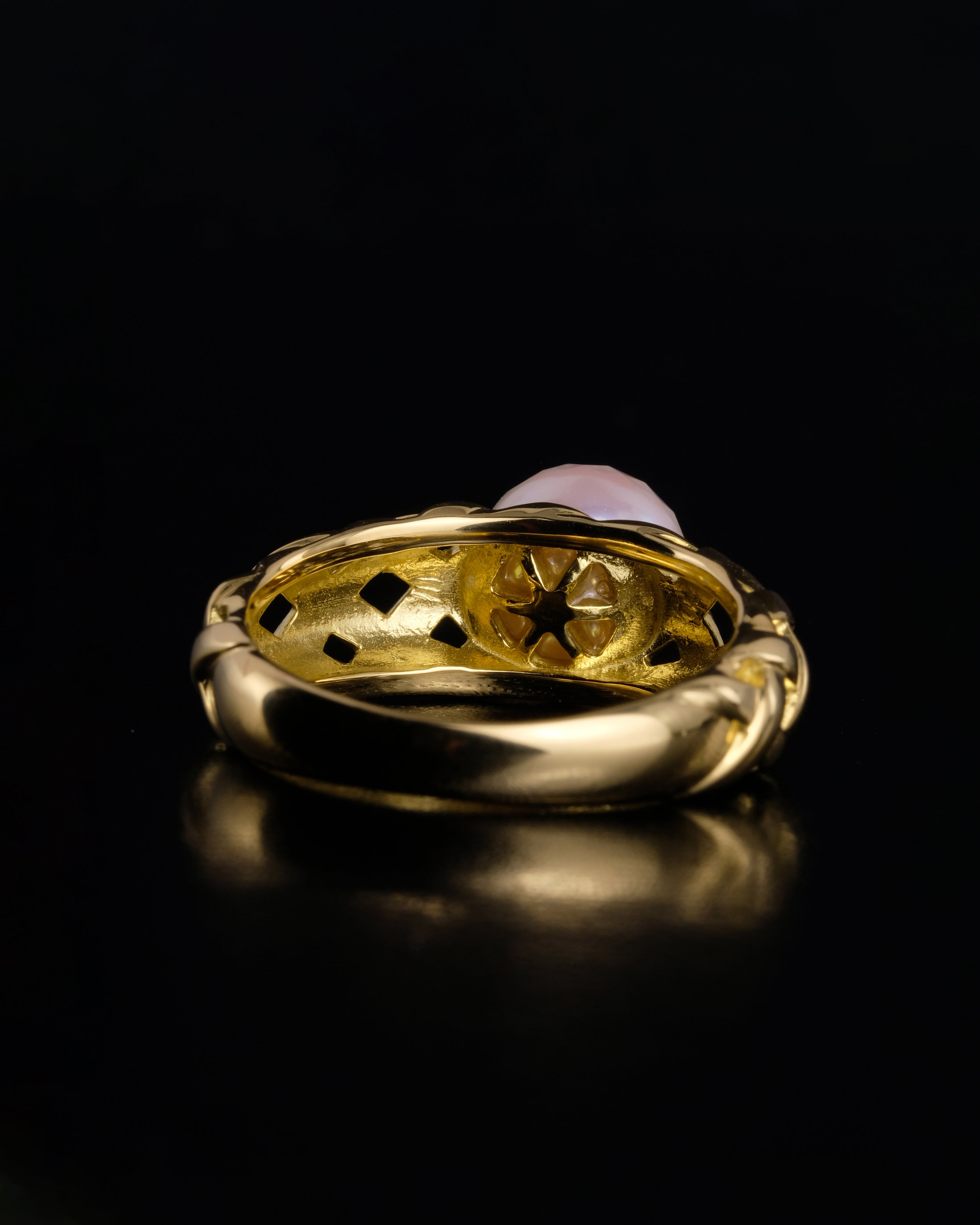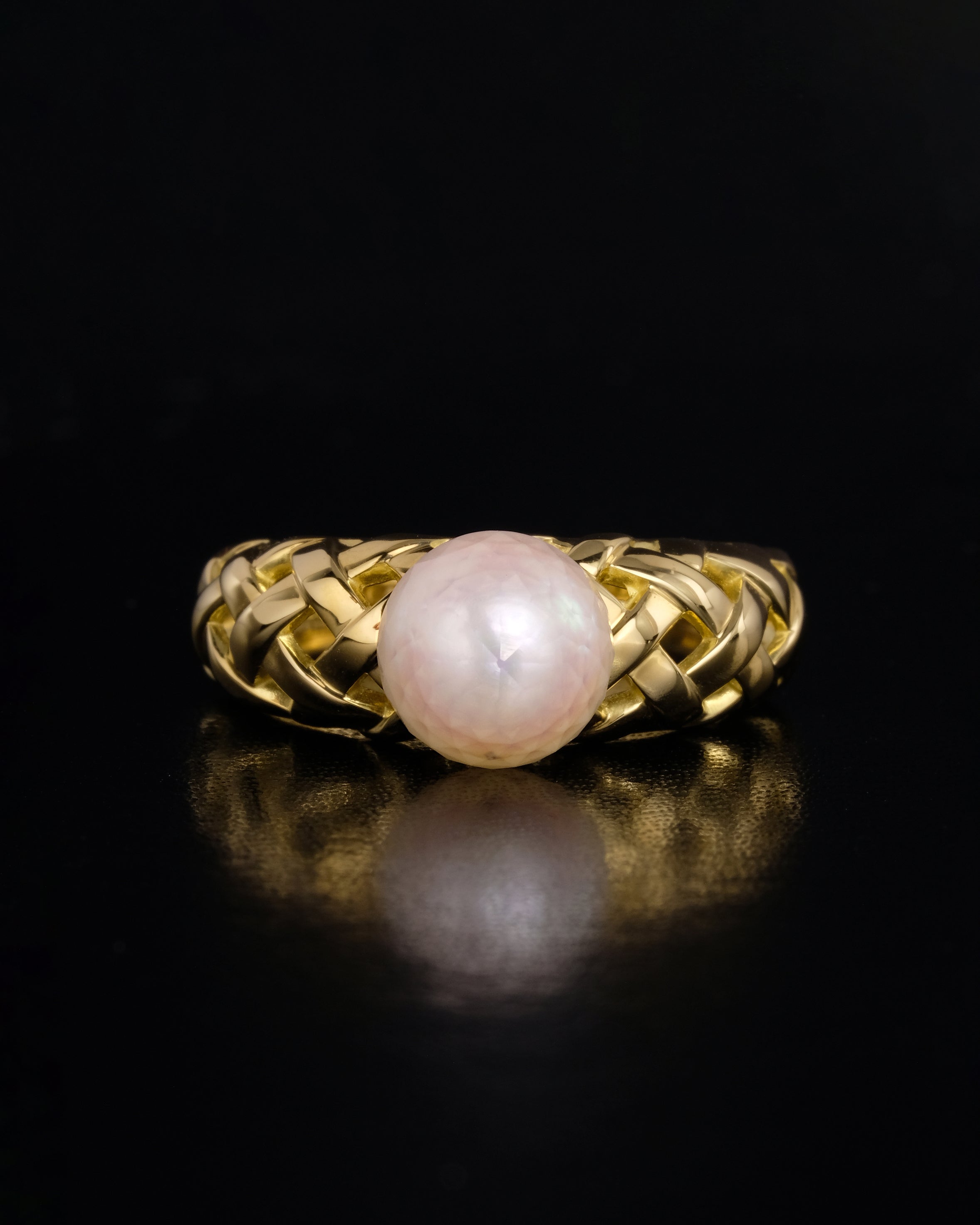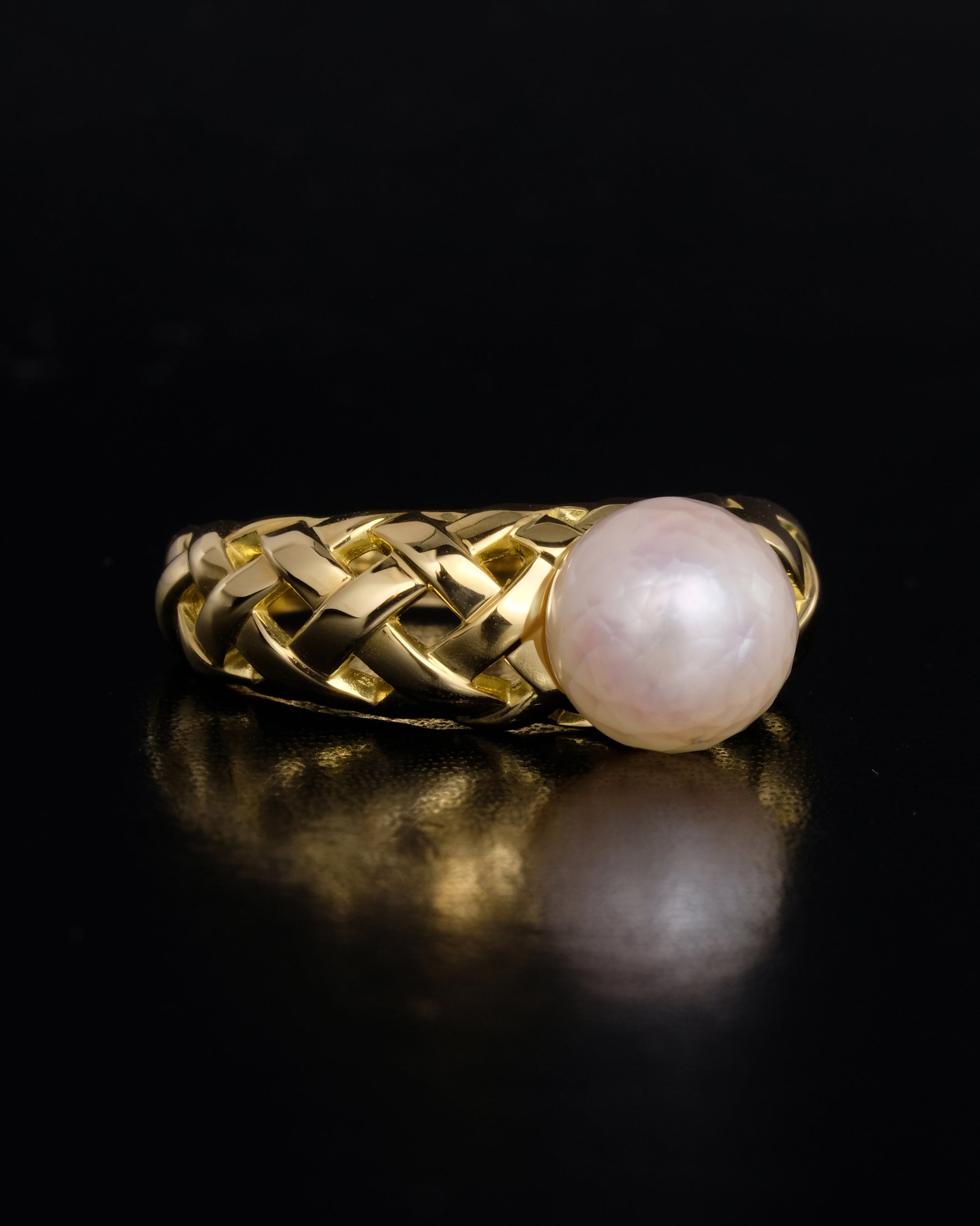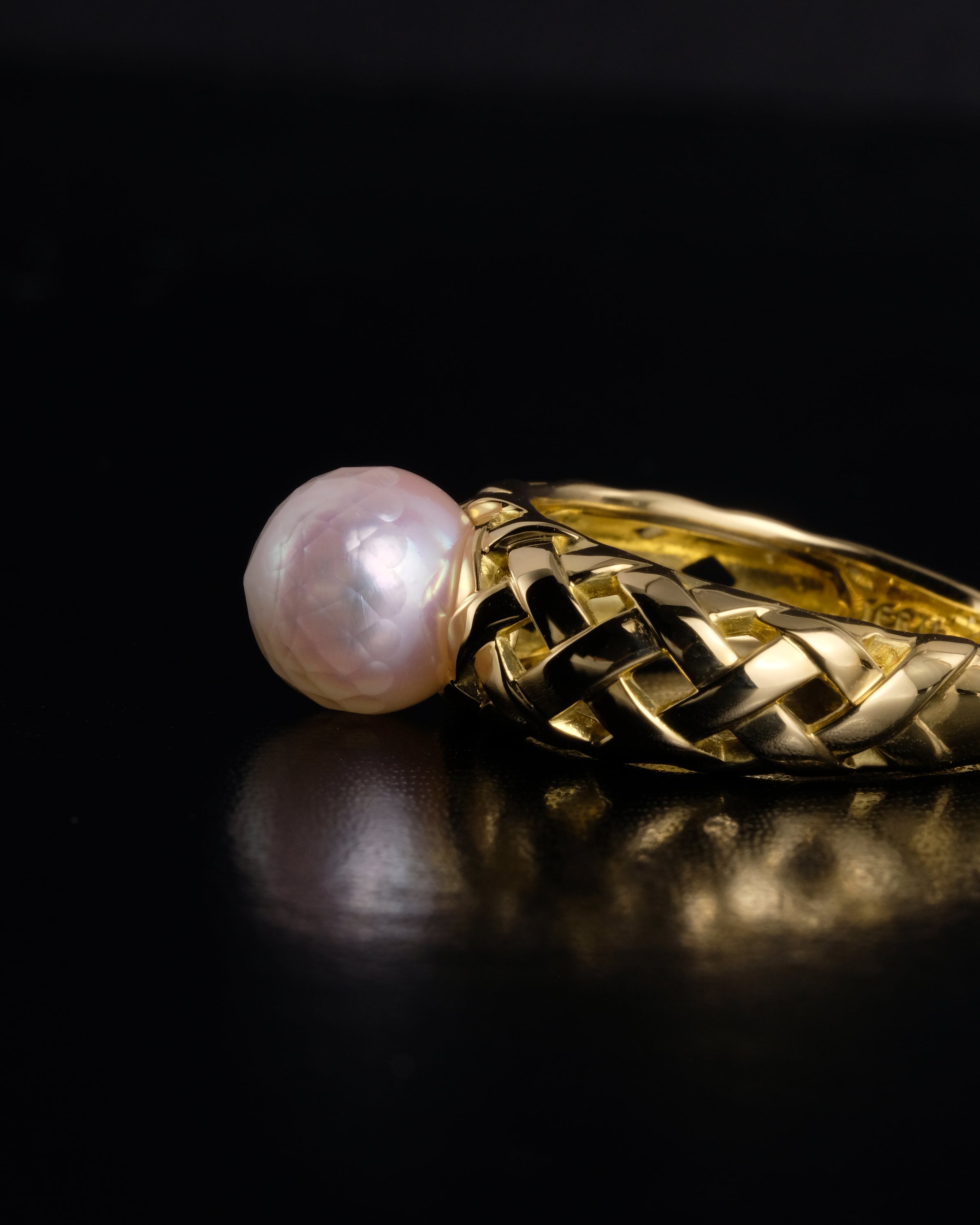 半面にファセットカットを施したあこや真珠の重厚なリング。