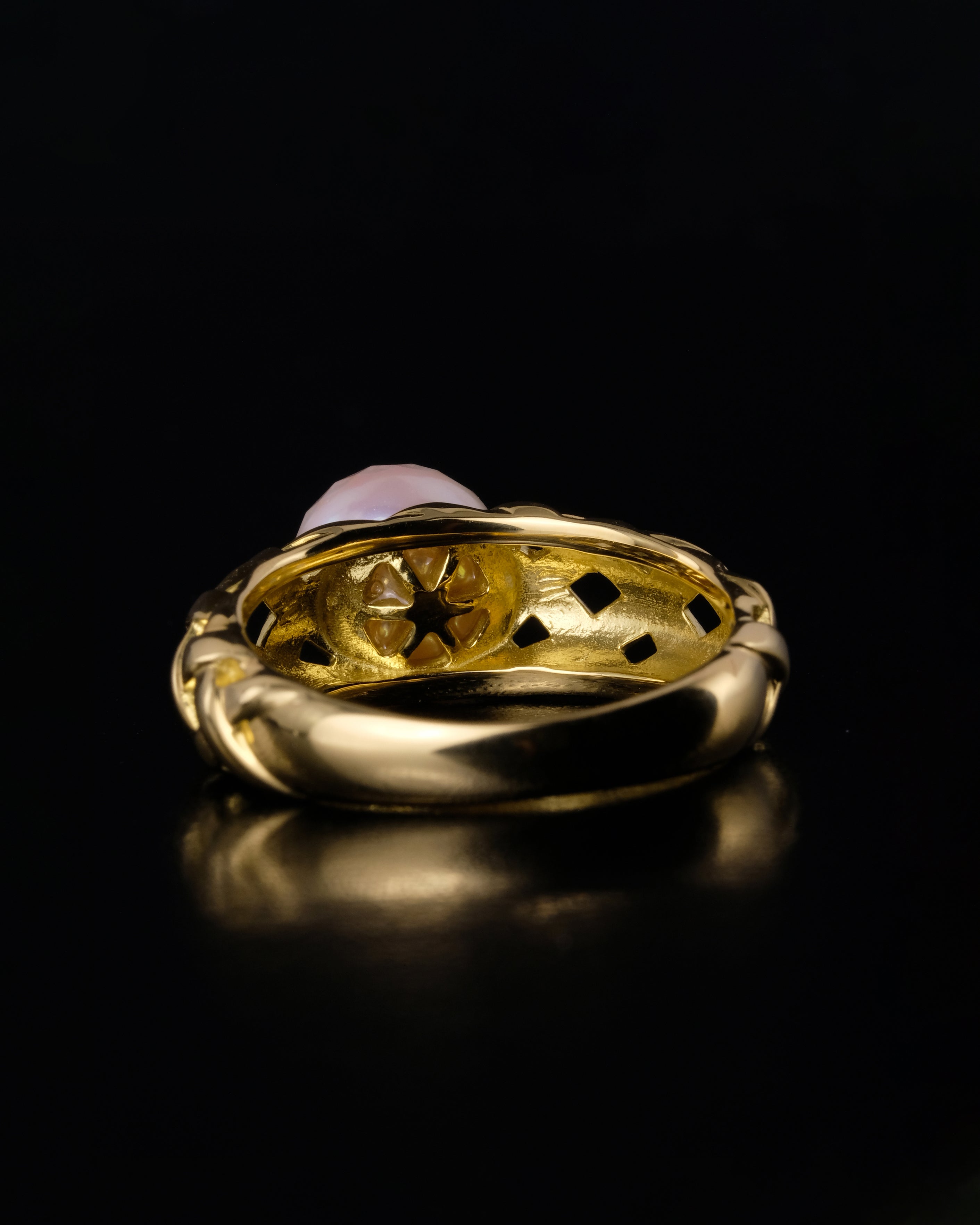 This ring pairs the weight of precious metals with the soft glimmer of a specially cut Akoya pearl,commissioned exclusively for iErté.