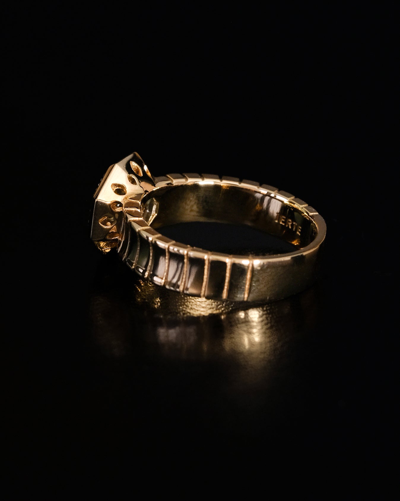 A fine milgrain of gold encircles the star,its glimmer heightened by the cool clarity of platinum.